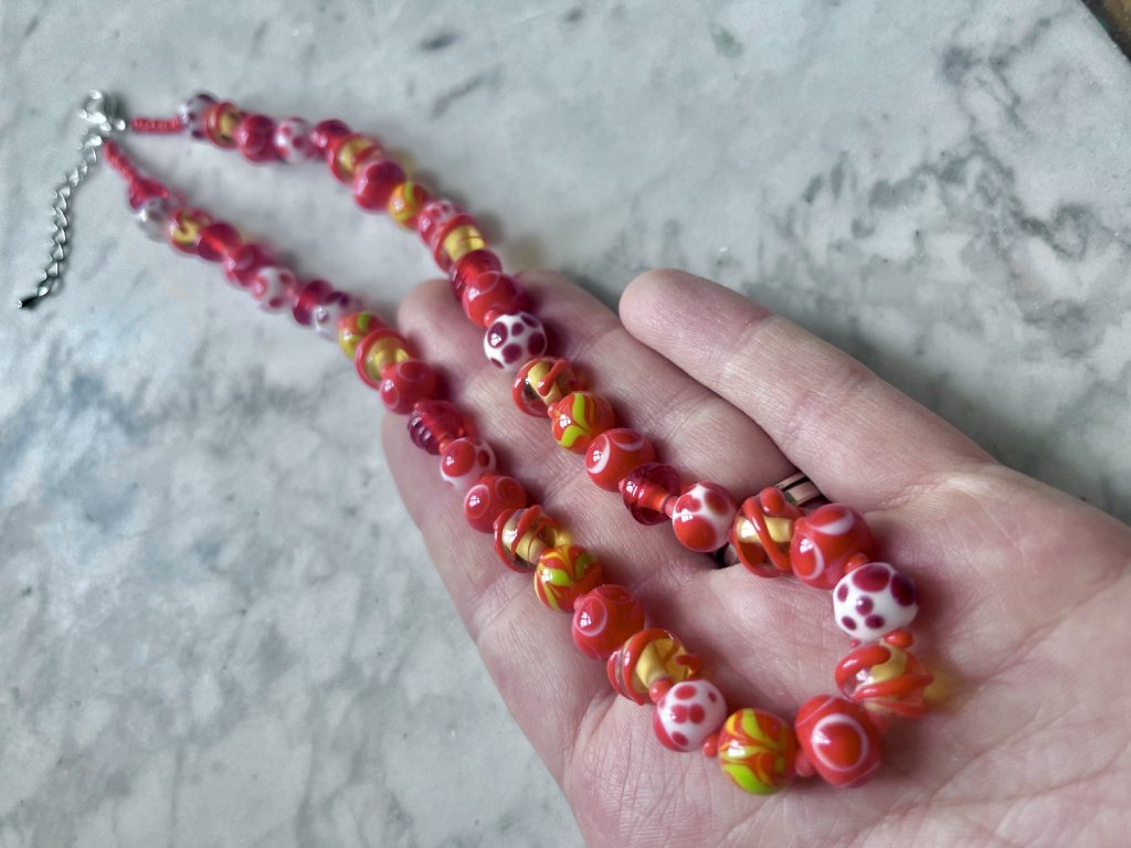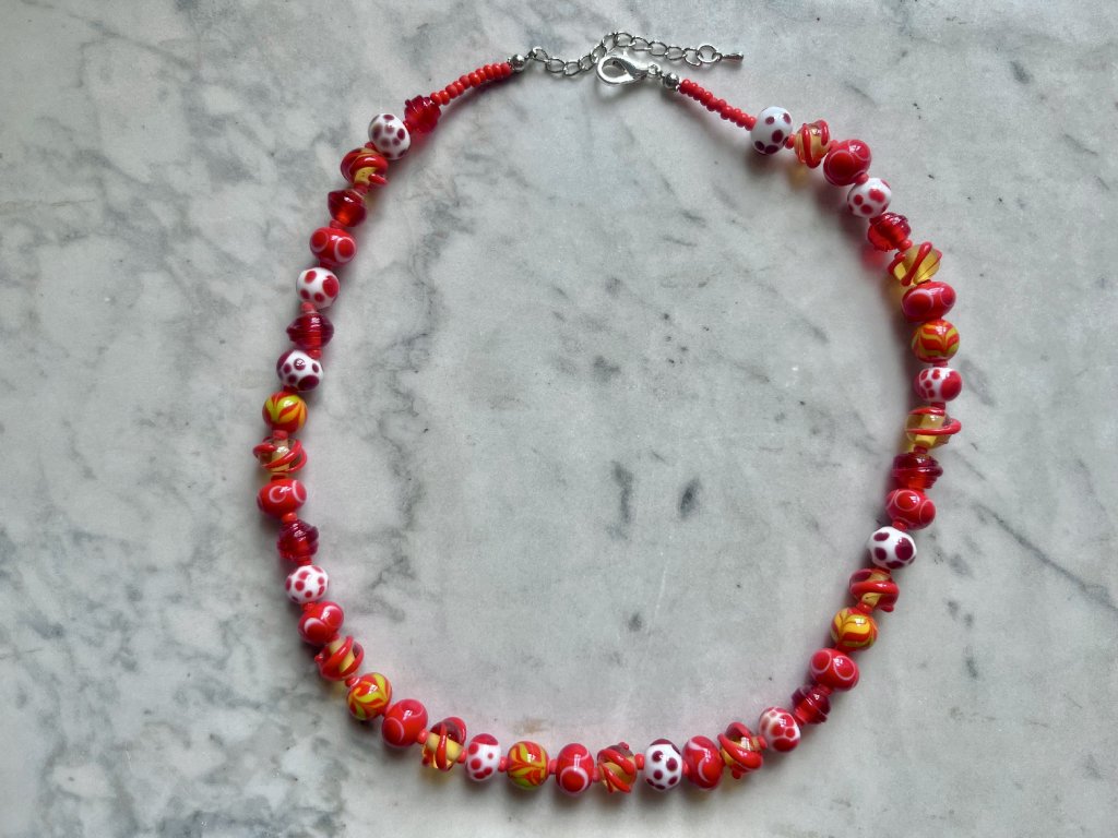 Vdechněte svému stylu originalitu s tímto jedinečným náhrdelníkem z ručně vinutých perel. Každý kus je pečlivě a s láskou vytvořen tradiční technikou vinutí skla nad plamenem – žádné dva náhrdelníky nejsou úplně stejné.
