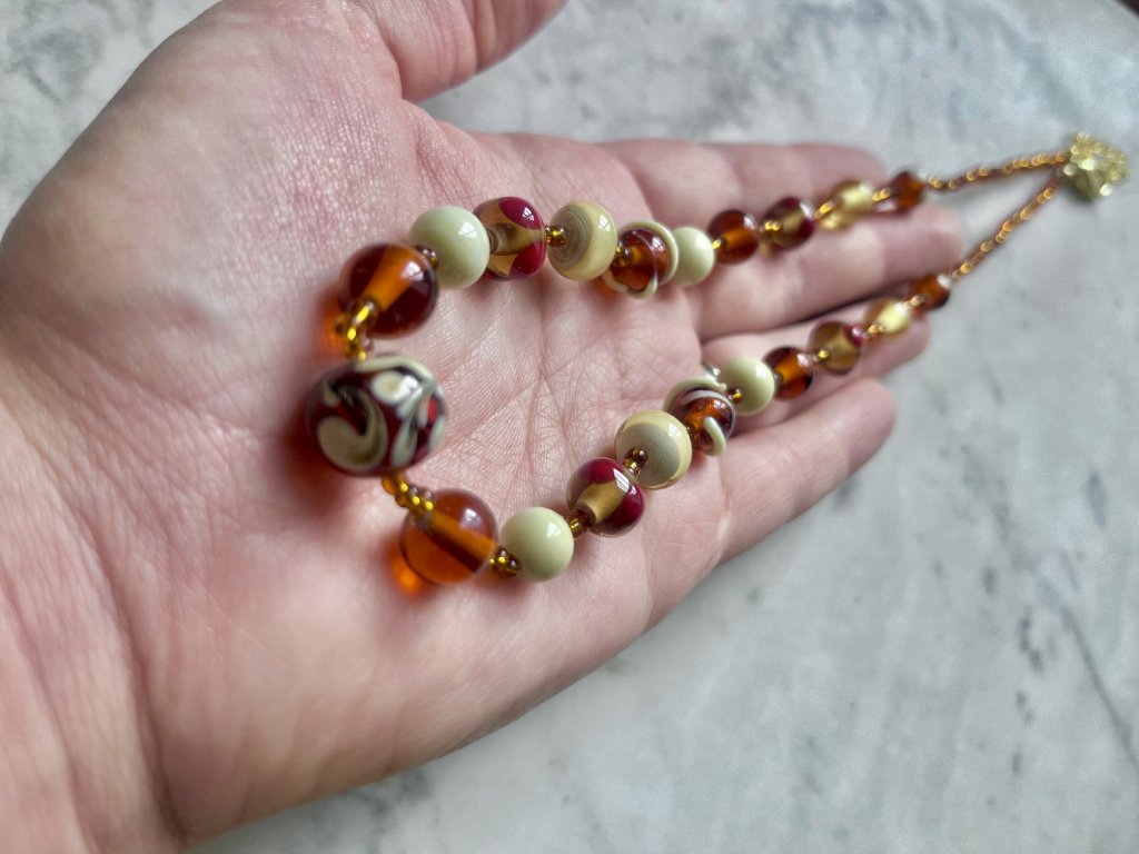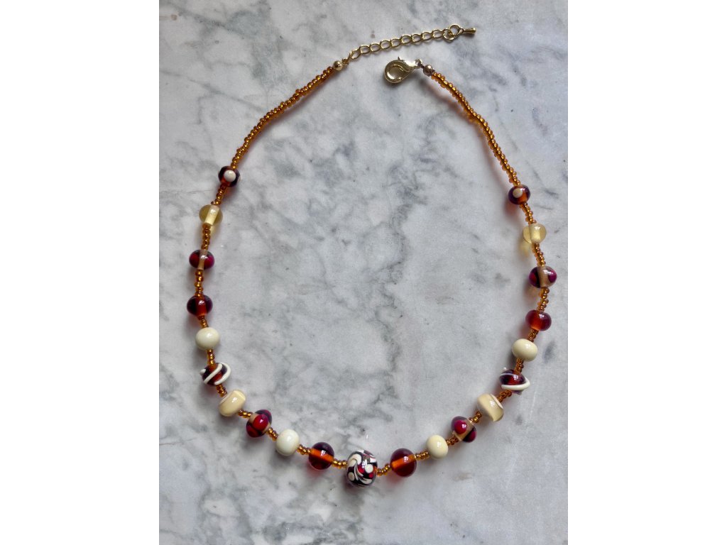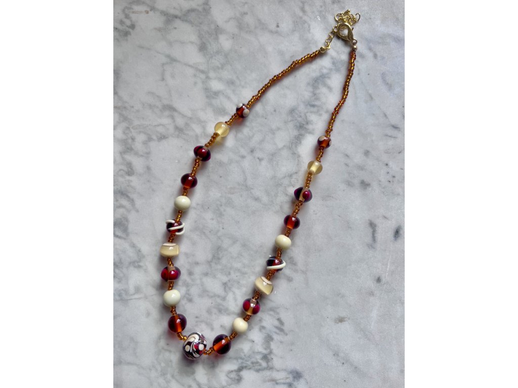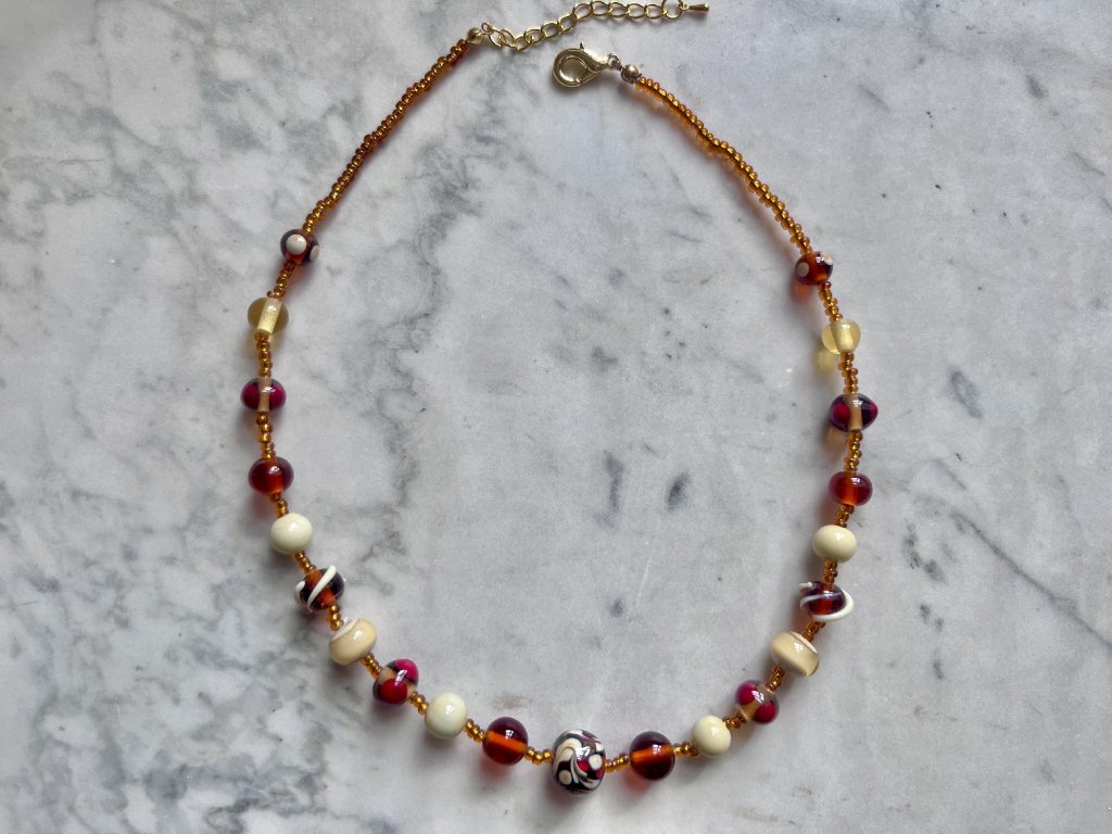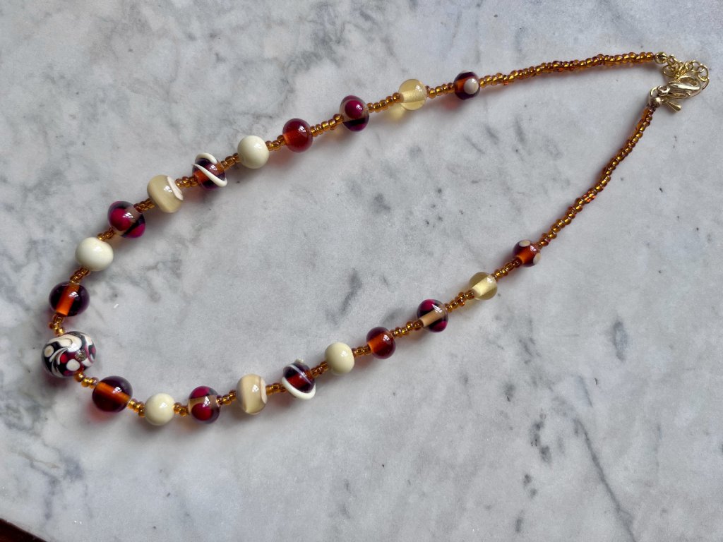 Vdechněte svému stylu originalitu s tímto jedinečným náhrdelníkem z ručně vinutých perel. Každý kus je pečlivě a s láskou vytvořen tradiční technikou vinutí skla nad plamenem – žádné dva náhrdelníky nejsou úplně stejné.